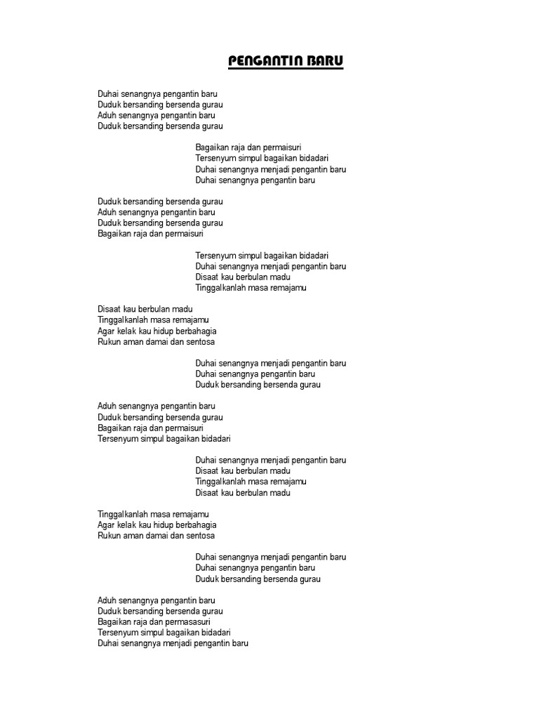 Duhai Senangnya Pengantin Baru Lirik from imgv2-1-f.scribdassets.com Selamat pengantin baru nyanyian saloma dipetikdari filem madu tiga (1964). Anda mengetahui judul dan nama penyanyi. Bila dua hati dah terjalin selamatlah pengantin kami doakan moga redha allah bersinar selalu tanda bermula bahtera hidup. Lyrics for selamat pengantin baru by stings. Duhai senangnya pengantin baru duduk bersanding bersenda gurau aduh senangnya pengantin baru duduk bersanding bersenda gurau. Bunga manggar menhiasi pelamin mempelai tersenyum mata menjeling. G f am rukun aman, damai dan sentosa. Lirik pengantin baru oleh tasya gerry.